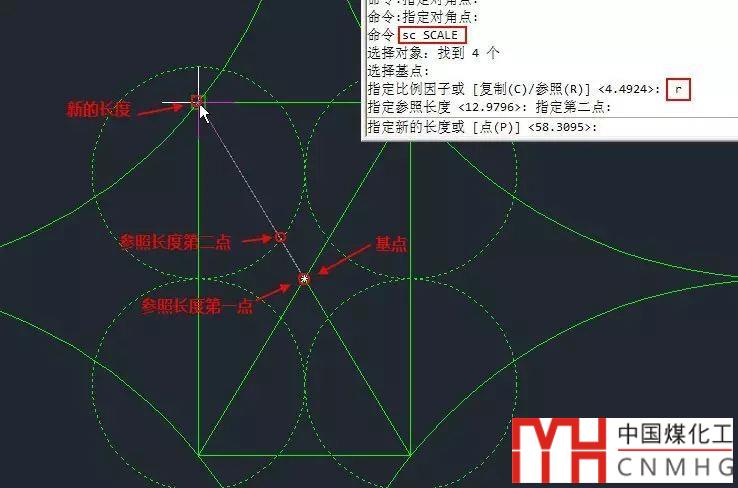 這張圖只給出了矩形的尺寸,四個圓的相互位置很明確,如果知道半徑很容易畫出來。但需要想辦法獲取圓的尺寸,通過計算顯然很麻煩,因此需要找出矩形和圓之間的關系,然后利用縮放SC命令的參照參數(shù)來得到最終的圓。