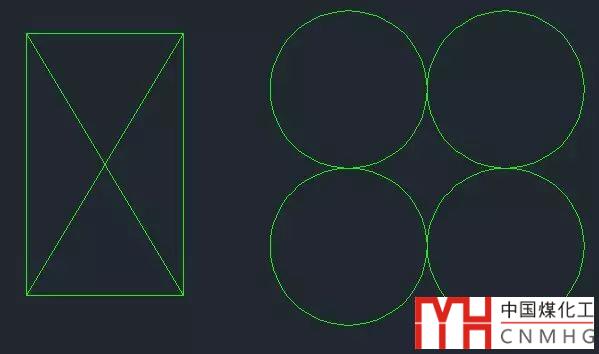 下面我們就要利用SC命令來縮放四個圓了,當我們將圓和矩形移到一起后就會發(fā)現(xiàn),如果連接矩形的對角線與四個圓的交點,得到的矩形應該跟我們繪制的矩形是相似的,我們可以把它作為基準來縮放圓,當將這個矩形放大到跟我們繪制的矩形一樣大的時候,圓就可以滿足要求了。