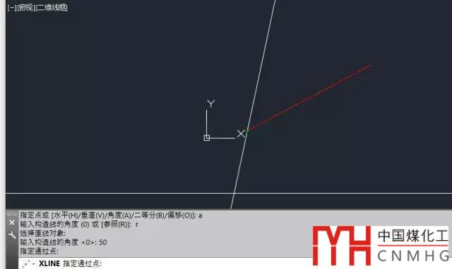 輸入XL,回車,輸入A,回車,輸入R回車,選擇圖中的直線,角度輸入50,然后再圖中指定一個(gè)點(diǎn)來(lái)確定構(gòu)造線的位置,如下圖所示。