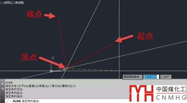 所謂二等分就是角平分線,創(chuàng)建方法也很簡(jiǎn)單,輸入二等分參數(shù)B后,設(shè)置好角的頂點(diǎn)、起點(diǎn)和端點(diǎn),就可以創(chuàng)建出角平分線。如果多個(gè)角度的起始角相同,可以連續(xù)創(chuàng)建,多次指定端點(diǎn),如下圖所示。