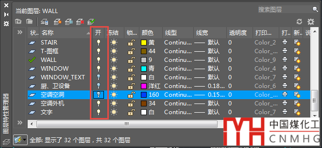 下圖中的小燈泡圖標(biāo)是圖層開關(guān),單擊該圖標(biāo)可以循環(huán)地打開或關(guān)閉圖層,對于被打開的圖層,其上所有圖形對象均為可見;對于被關(guān)閉的圖層,其上所有圖形對象將被隱藏。