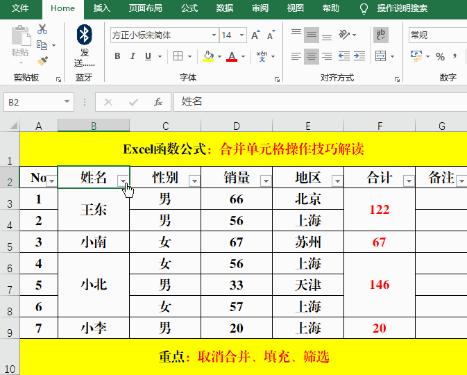 三、合并單元格篩選。