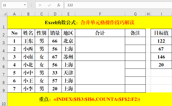 1、想要理解上述公式,首先必須搞清楚合并單元格的值的存儲(chǔ)位置——左上角單元格。暨合并單元格的值都存儲(chǔ)在合并區(qū)域的第一行、第一列的交叉單元格中。