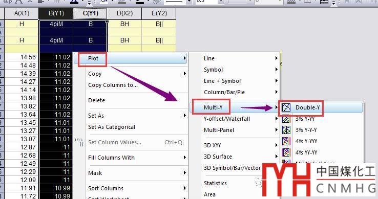 設(shè)置第1列和第4列為X軸,B、C和E列分別為圖層1,2和3的數(shù)據(jù)。