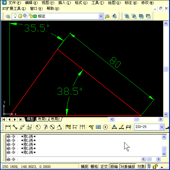 圖中又只給了一個(gè)80的尺寸,但給了兩個(gè)角度,這張圖畫起來不難,就是兩個(gè)角度處理起來有點(diǎn)麻煩,我們可以算一算跟X正向的夾角,也可以直接繪制后旋轉(zhuǎn)。