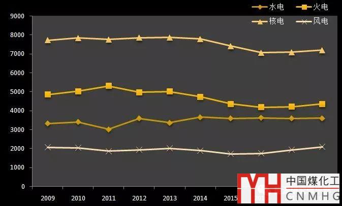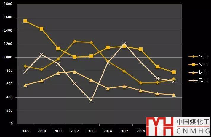 從不同電源的投資來(lái)看,增速差別巨大。其中水電投資674億元,增速為8.4%;火電投資777億元,同比降低9.4%;核電投資437億元,同比降低3.8%;風(fēng)電投資642億元,同比降低5.7%。