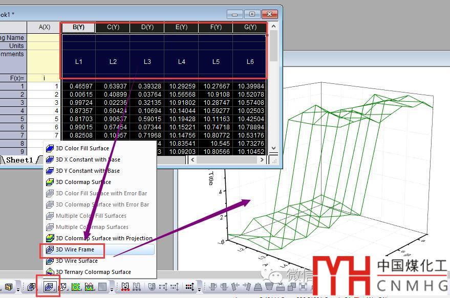 選擇XYYYYY數(shù)據(jù),插入3D Wire Frame圖,用作三維的點(diǎn)+線(xiàn)圖(Line+Scatter)的線(xiàn)。