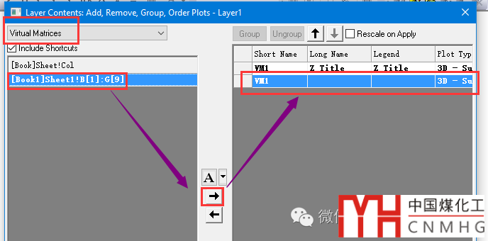 在Layer Contens界面,左上角的數(shù)據(jù)來(lái)源中選擇Virtual Matrices,將VM1再次添加到右側(cè)。