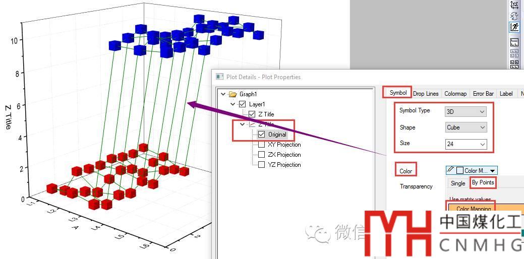 打開(kāi)Plot Details對(duì)話(huà)框,將第二個(gè)Z title的Plot Type改為3D-Matrix Scatter,初具三維的點(diǎn)+線(xiàn)圖(Line+Scatter)的樣子。