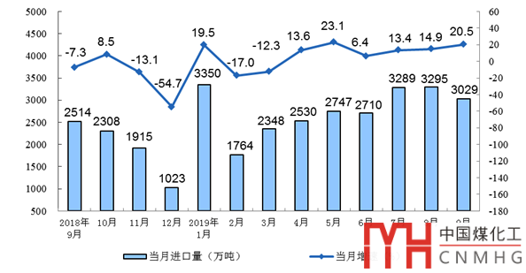 9月份,進(jìn)口煤炭3029萬(wàn)噸,同比增長(zhǎng)20.5%,環(huán)比減少266萬(wàn)噸。前三季度,進(jìn)口煤炭25057萬(wàn)噸,同比增長(zhǎng)9.5%,比上半年加快3.7個(gè)百分點(diǎn)。
