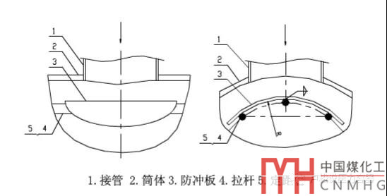 這種結(jié)構(gòu)是方形防沖板的改進,其主要特點是防沖板有一定的彎曲,使防沖板外表面最高點至筒內(nèi)壁的距離不小于外徑的1/4~1/5(這個數(shù)值不知出處,需要驗證),這樣對布管數(shù)的影響較小。相對于方形防沖板,阻力降也小,流體分布也相對均勻。