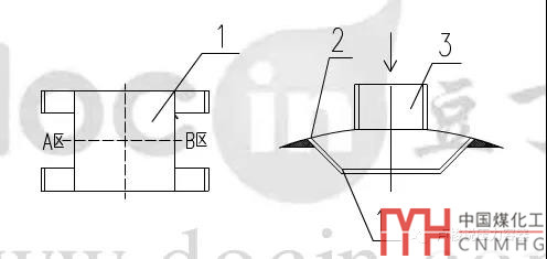 文章稱之為“方形防沖板”,這種結(jié)構(gòu)設(shè)計簡單,流體主要從A、B區(qū)進入管束。這種結(jié)構(gòu)的缺點是,進入管束的流體分布不均,所占據(jù)的空間較大,對于臥式換熱器會在進口靠近管板處產(chǎn)生死區(qū),對于立式換熱器會浪費一部分進口處的換熱面積。其引起的壓降略大于防沖桿。