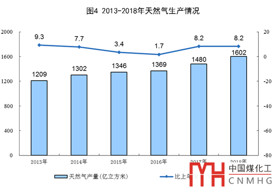 天然氣連續(xù)兩年增產(chǎn)超百億立方米。2018年,天然氣產(chǎn)量1602億立方米,比上年增產(chǎn)122億立方米,常規(guī)天然氣和非常規(guī)天然氣分別增產(chǎn)94億立方米和28億立方米。與2013年比,天然氣產(chǎn)量增長37.5%,年均增長6.6%。
