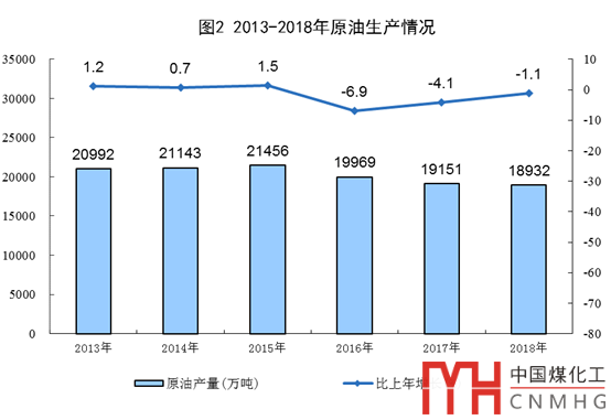 原油生產(chǎn)略有下降。2018年生產(chǎn)原油18932萬噸,比2013年下降9.8%,年均下降2.0%。近兩年,黑龍江大慶油田、天津渤海油田、陜西長慶油田和延長油田、山東勝利油田以及新疆克拉瑪依等主力油田積極增儲(chǔ)上產(chǎn),連續(xù)兩年產(chǎn)量超過1000萬噸,全國原油生產(chǎn)降幅連續(xù)收窄。