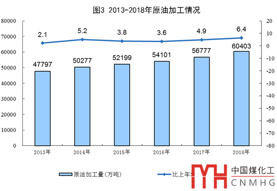 原油加工能力穩(wěn)步提升。2018年加工原油60403萬噸,位居世界第二,僅次于美國,比2013年增長26.4%,年均增長4.8%。生產(chǎn)成品油38230萬噸,比2013年增長18.7%,其中汽油、煤油和柴油產(chǎn)量分別增長42.0%、89.7%和0.5%,燃料油下降17.6%。