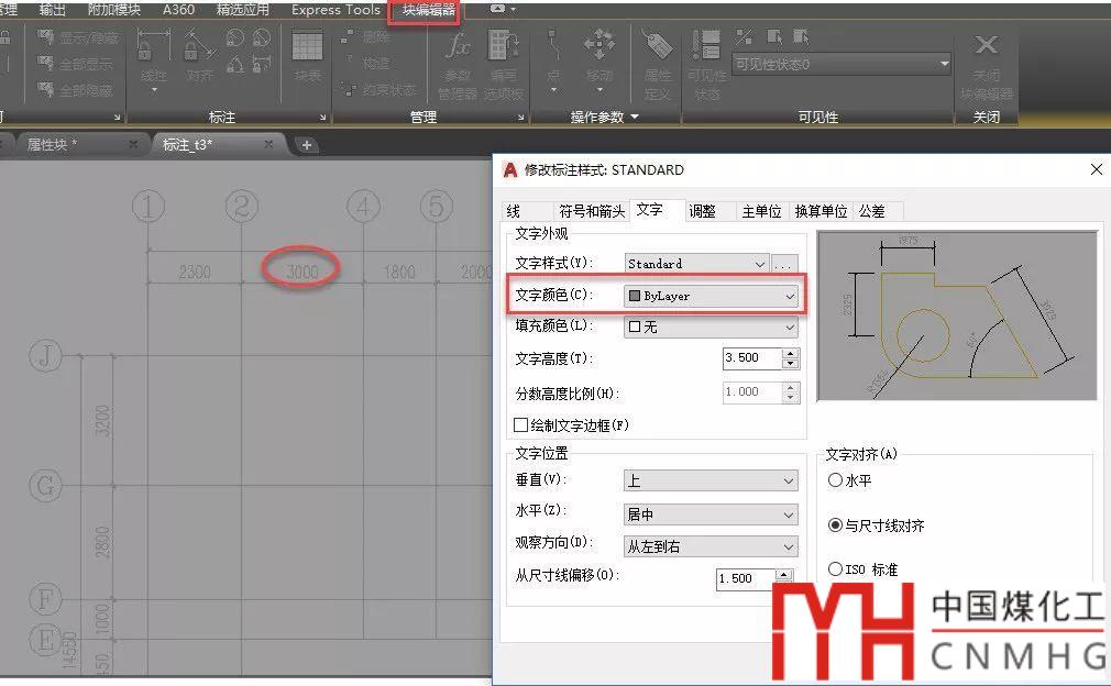 我想看看圖塊中這個標注文字的屬性到底有什么特殊之處,但炸開此圖塊或進入塊編輯器后,標注的顏色就變成了灰色,在標注樣式管理器里檢查文字的顏色也確實是隨層,如下圖所示。