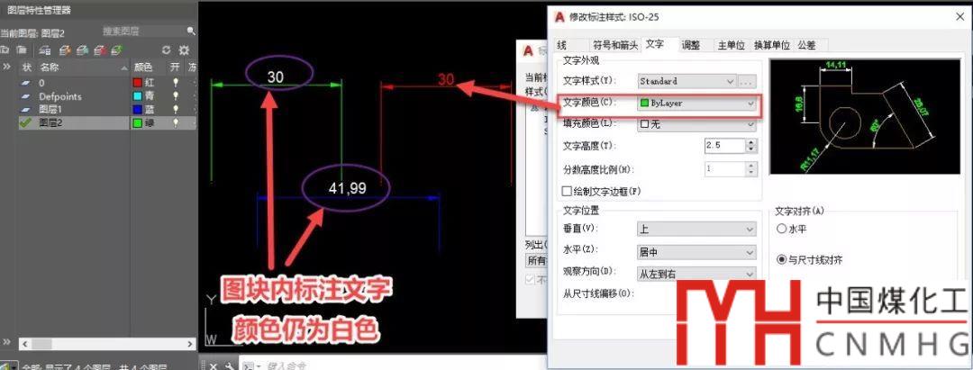 如果標注線和文字的默認顏色是隨塊BYBLOCK,而標注對象默認的顏色是隨層BYLAYER,此時調(diào)整圖層顏色,塊中的標注的顏色會變,如下圖所示。