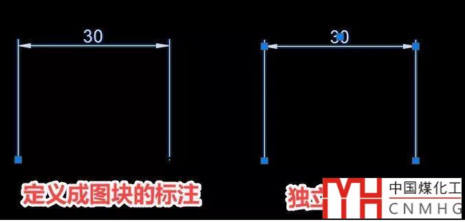 打開一張新圖,用默認的標注樣式繪制兩個線性標注,然后選中其中一個標注定義成圖塊,如下圖所示。