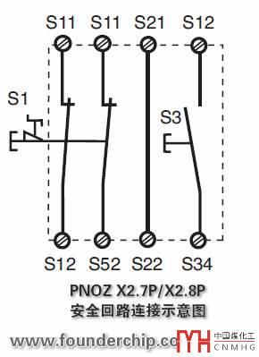 PNOZ X2.7P/X2.8P可以使用直流24V(DC 24V)或交流24V(AC 24V)供電,有6個(gè)安全接線端子:S11、S12、S21、S52、S22和S34。可組成兩路安全通道和一路復(fù)位通道。其中,S52和S22構(gòu)成安全通道1(CH1),S12和S21構(gòu)成安全通道2(CH2);S11連接電源正極,S21連接電源負(fù)極,S34用于復(fù)位;