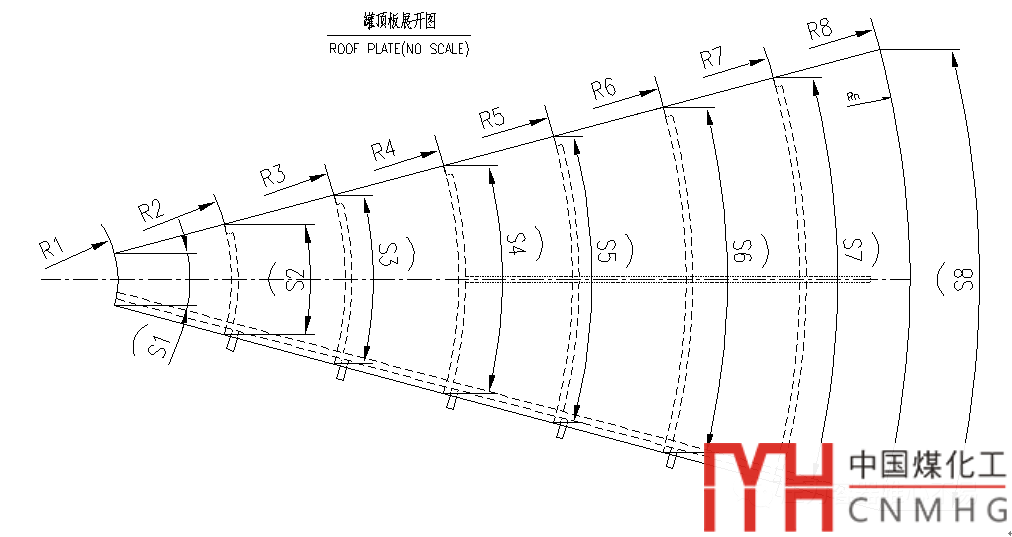 如果儲(chǔ)罐帶肋,那么在完成詳圖繪制后,可能少量的修改,比如包邊角鋼的位置形式和罐頂板展開(kāi)尺寸的標(biāo)注。需要標(biāo)注的數(shù)值在圖形中用表列的形式表示出來(lái)了(見(jiàn)下表),只需要按圖填寫(xiě)進(jìn)去就行了。