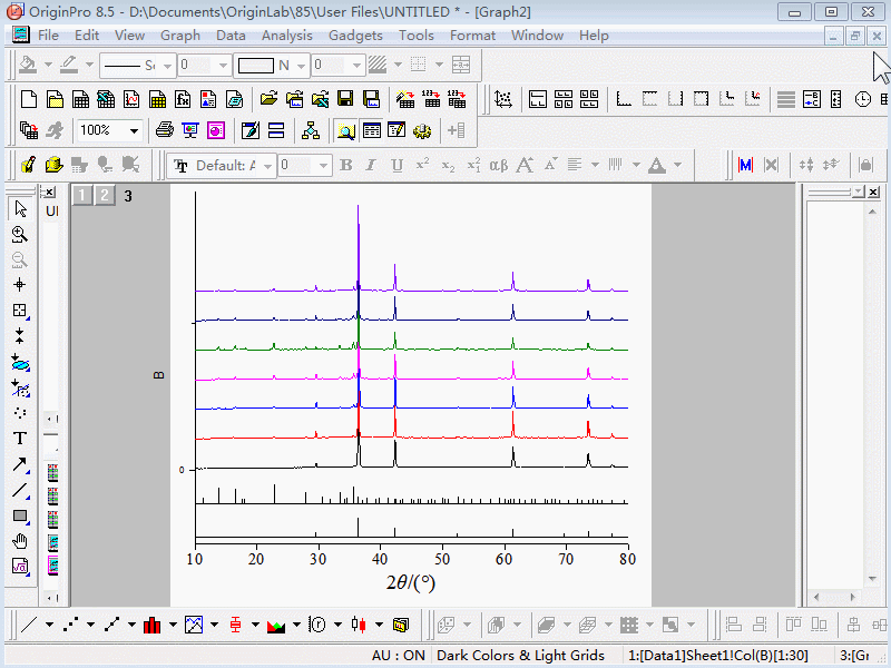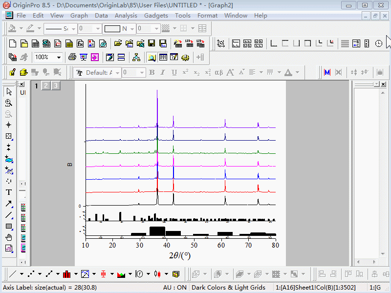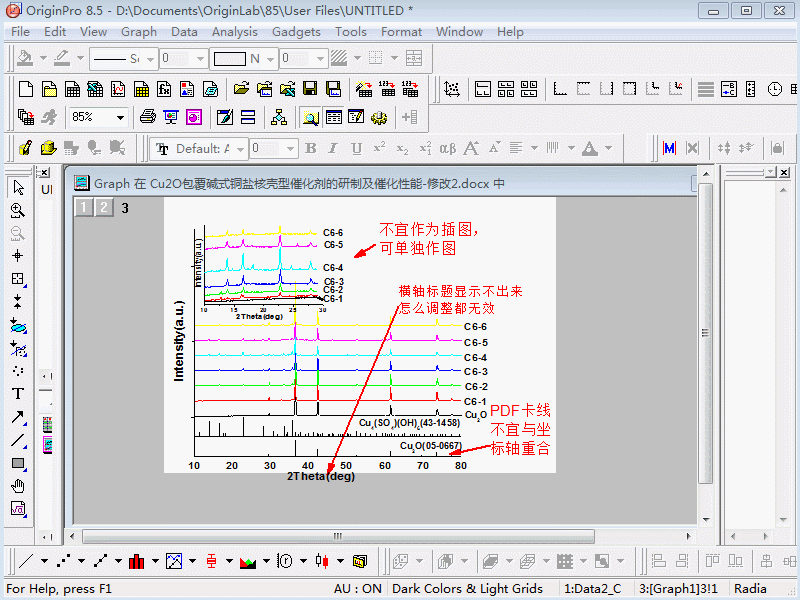 這就結(jié)束了?那原稿圖中的插圖怎么辦?我說過,會單獨作圖,而且這個插圖是上圖中10°~35°范圍的,這個范圍的衍射峰很弱,怎樣放大?修改縱坐標(biāo)范圍?這是不行的。難道要重新去XRD儀器上再掃描一遍?別!別!別!我的學(xué)生都已經(jīng)畢業(yè)了,我們的樣品也用完了。