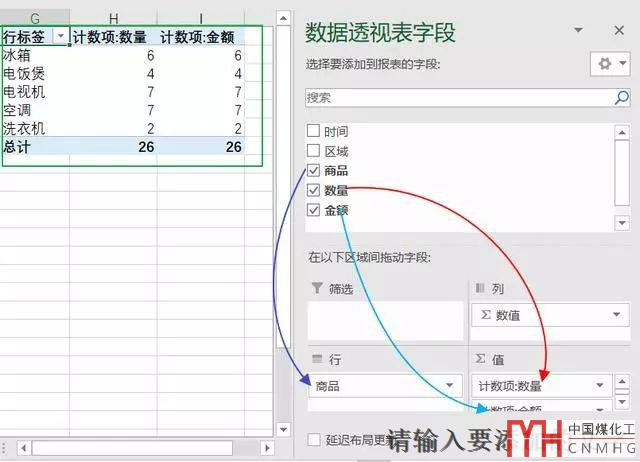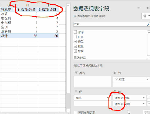 這里我們可以在值里面,看到數(shù)量和金額的匯總方式都是計(jì)數(shù)項(xiàng)的,我們需要把這兩個(gè)字段的求和方式更改一下,改成求和