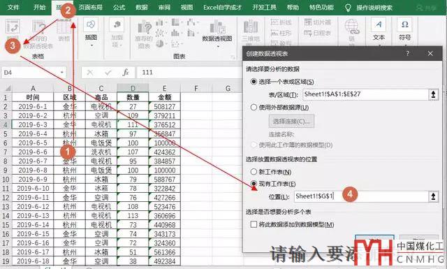 我們使用數(shù)據(jù)透視表的方法,選中原始數(shù)據(jù)單元格任意一個(gè)單元格,然后在插入選項(xiàng)下,插入數(shù)據(jù)透視表,我們可以將數(shù)據(jù)透視表放在現(xiàn)有工作表的G1單元格