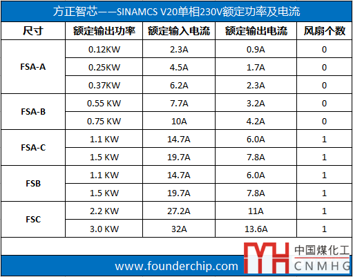 單相230V AC變頻器的FSA-A、FSA-B兩款沒有散熱風(fēng)扇;FSA-C、FSB和FSC三款變頻器有一個散熱風(fēng)扇;不同尺寸的變頻器的額定功率及電流見下面的表格: