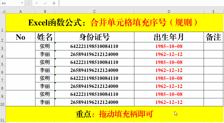 實際的工作中,都會遇到給合并的單元格填充序號的問題,如果合并的單元格行數(shù)一致則比較簡單,直接拖動填充柄就可以。如下圖: