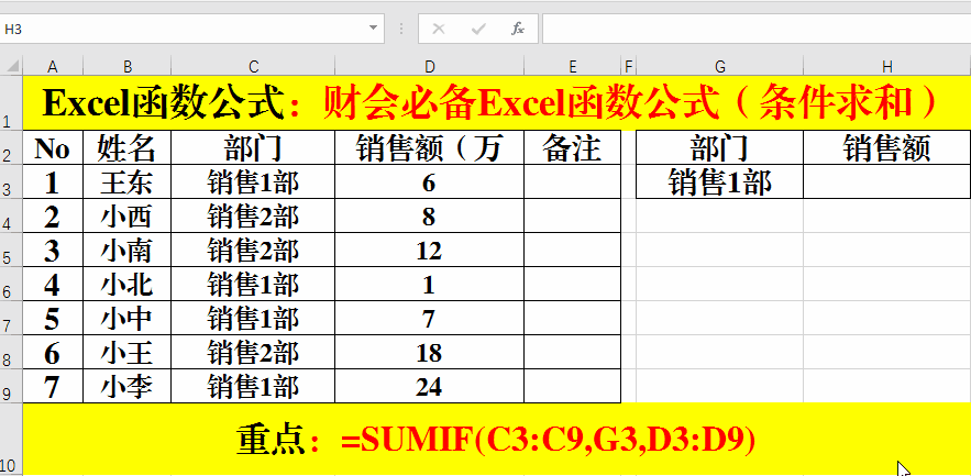 1、在目標單元格中輸入公式:=SUMIF(C3:C9,G3,D3:D9)。