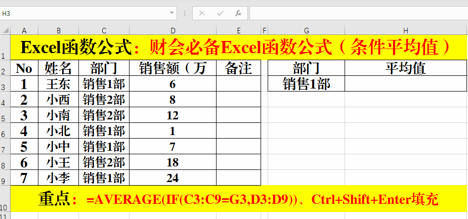 1、在目標單元格中輸入公式:=AVERAGE(IF(C3:C9=G3,D3:D9))。