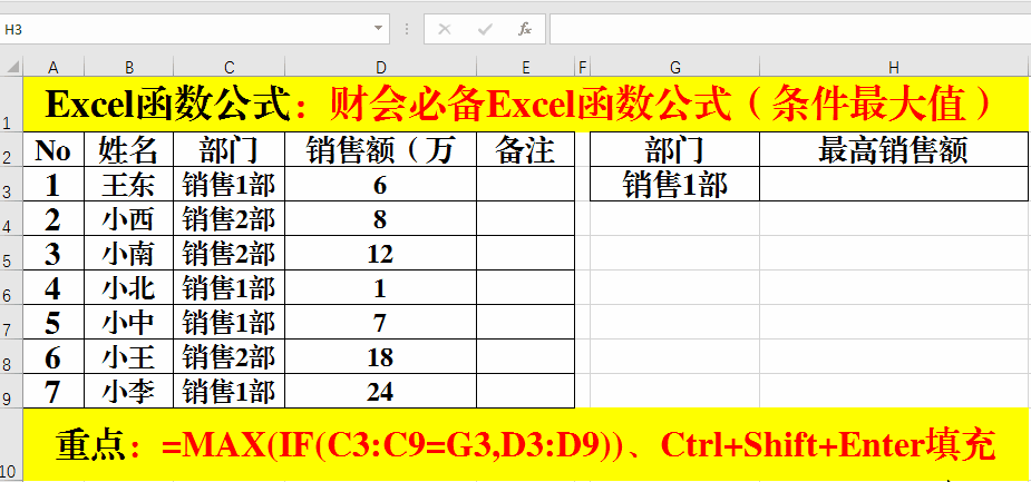 1、在目標單元格中輸入公式:=MAX(IF(C3:C9=G3,D3:D9))。