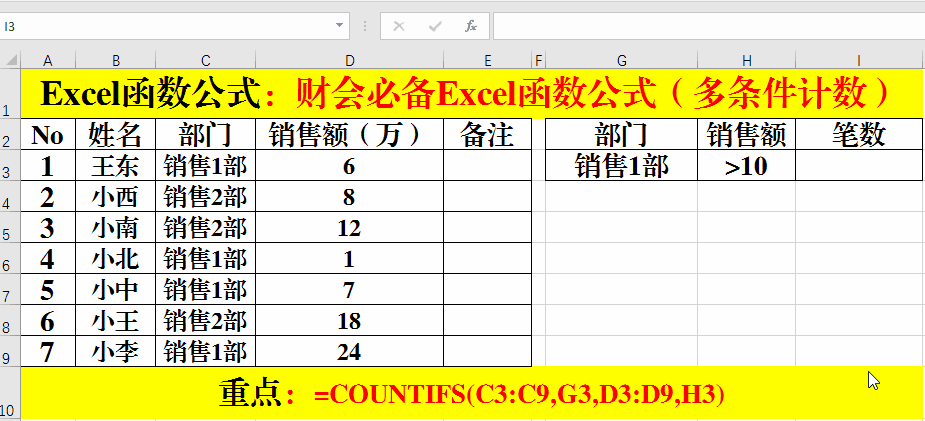 1、在目標單元格中輸入公式:=COUNTIFS(C3:C9,G3,D3:D9,H3)。