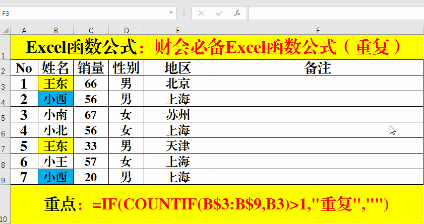 2、輸入公式:=IF(COUNTIF(B$3:B$9,B3)>1,"重復(fù)","")。
