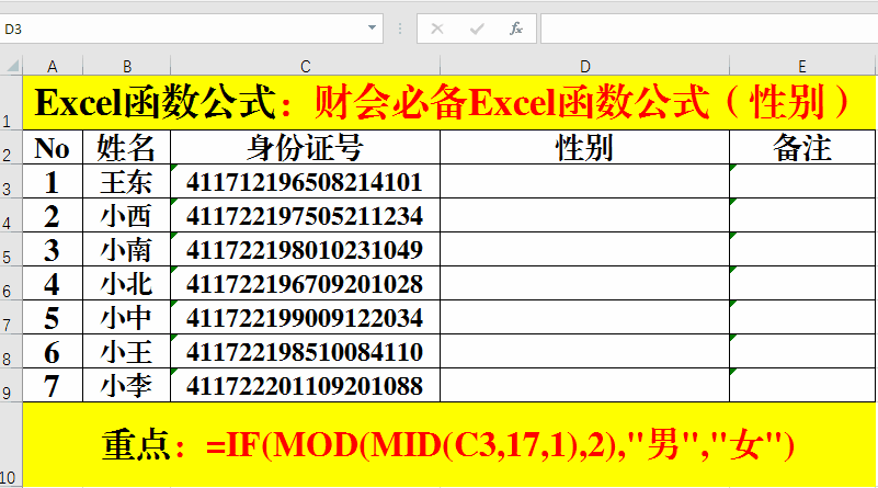2、輸入公式:=IF(MOD(MID(C3,17,1),2),"男","女")。