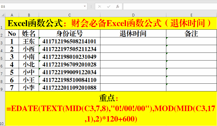2、輸入公式:=EDATE(TEXT(MID(C3,7,8),"0!/00!/00"),MOD(MID(C3,17,1),2)*120+600)。