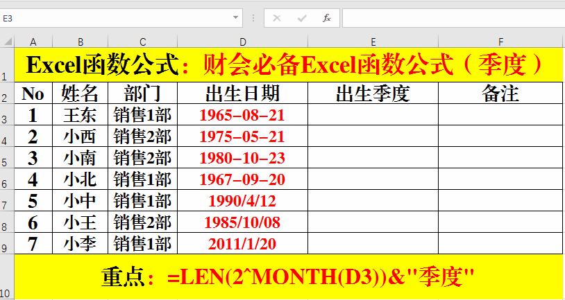 2、輸入公式:=LEN(2^MONTH(D3))&"季度"。