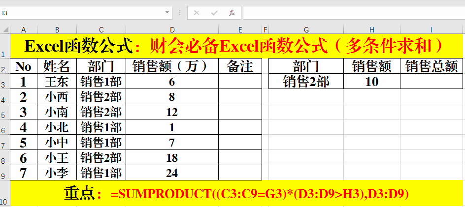 1、在目標單元格中輸入公式:=SUMPRODUCT((C3:C9=G3)*(D3:D9>H3),D3:D9)。
