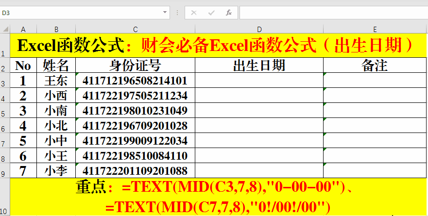 2、輸入公式:=TEXT(MID(C3,7,8),"0-00-00")或=TEXT(MID(C7,7,8),"0!/00!/00")。