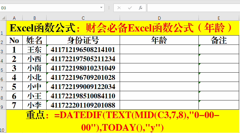 2、輸入公式:=DATEDIF(TEXT(MID(C3,7,8),"0-00-00"),TODAY(),"y")。