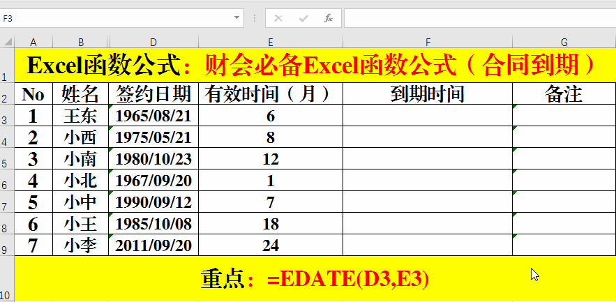 2、輸入公式:=EDATE(D3,E3)。