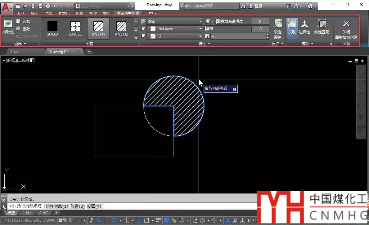 從AUTOCAD采用RIBBON功能區(qū)界面開始后,創(chuàng)建和編輯填充時填充的參數(shù)就顯示到了填充的上下文的功能區(qū)選項卡,如下圖所示。