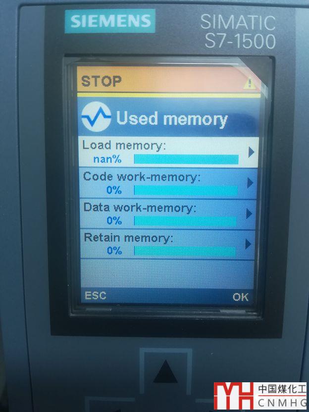 S7-1500方便之處在于CPU有顯示面板,可以直接在面板進行診斷,查看報錯的原因。于是我進入診斷(Diagnostic)界面,我發(fā)現(xiàn)在【已用存儲器(Used Memory)】中的【裝載存儲器(Load Memory)】中顯示的是“nan%”,如下圖: