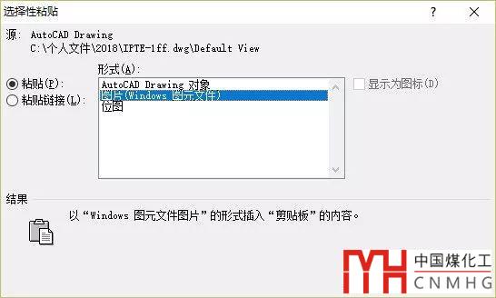 從CAD選擇對(duì)象并CTRL+C復(fù)制后,到WORD或EXCEL不直接粘貼,而是進(jìn)行選擇性粘貼,如下圖所示。