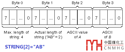 在STEP7中,字符串是N個(gè)字符(CHAR)的集合,N的范圍從0到254,字符串占用的存儲(chǔ)空間為N+2個(gè)字節(jié)。為什么N個(gè)字節(jié)長(zhǎng)度的字符串,要占用N+2個(gè)字節(jié)的存儲(chǔ)空間呢?這是因?yàn)镾TEP7規(guī)定字符串的第0個(gè)字節(jié)和第1個(gè)字節(jié)是用來(lái)表示該字符串的長(zhǎng)度的,從第2個(gè)字節(jié)開始,才用來(lái)存儲(chǔ)字符串的字符。規(guī)定如下:第0個(gè)字節(jié)(Byte0)表示該字符串的最大長(zhǎng)度;第1個(gè)字節(jié)(Byte1)表示該字符串的實(shí)際長(zhǎng)度。舉個(gè)例子來(lái)說(shuō):假設(shè)我們定義了一個(gè)字符串STRING[2]="AB",那么第0個(gè)字節(jié)(Byte0)的值為4;第1個(gè)字節(jié)(Byte1)的值為2;第2個(gè)字節(jié)(Byte2)的值為65("A"的ASCII碼);第3個(gè)字節(jié)(Byte3)的值為66("B"的ASCII碼),如下圖: