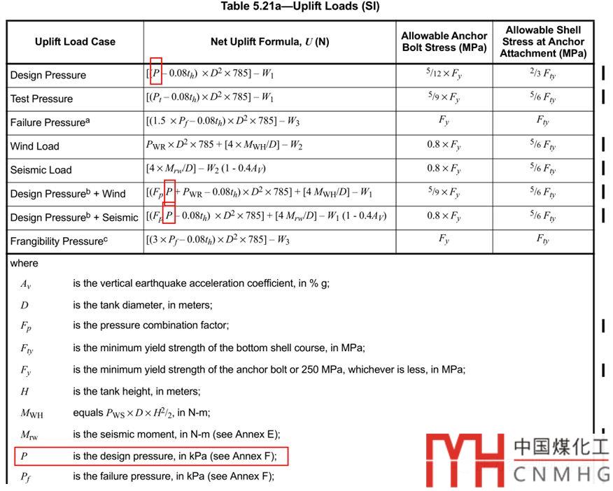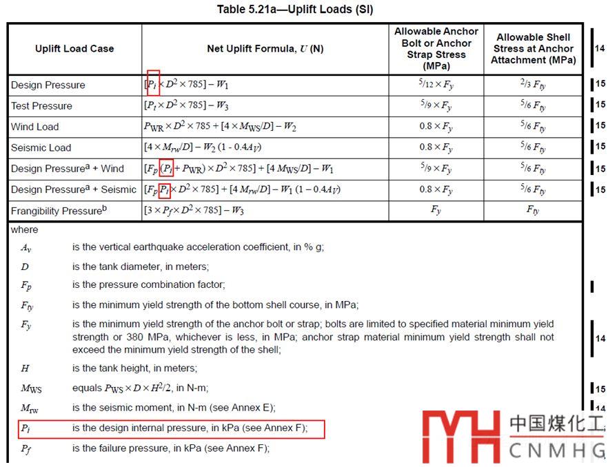 在API 650-2016中Table 5.21a公式已經(jīng)修改了,P改為了Pi,和附錄F的符號(hào),描述都能夠?qū)ι稀?/p>