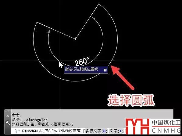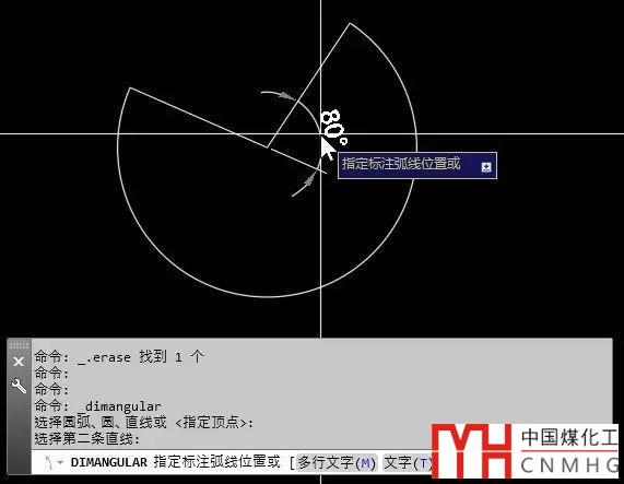 角度標注可以標注圓弧的角度,當選擇圓弧的時候,標注的角度不會進行轉換,如下圖所示。