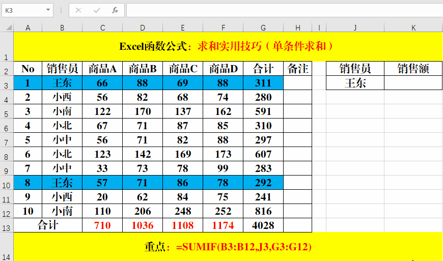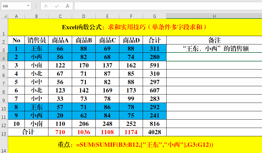 利用SUMIF函數(shù)分別求和“王東”和“小西”的銷售額。然后用SUM函數(shù)求出兩人的銷量和。