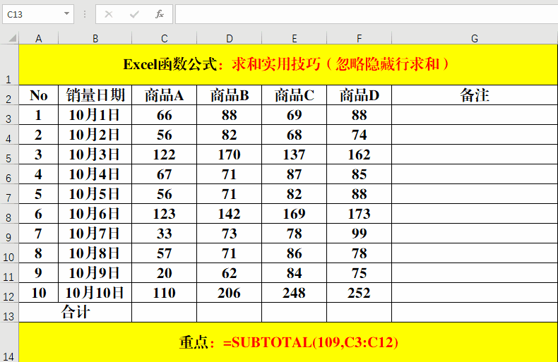 在目標(biāo)單元格中輸入公式:=SUBTOTAL(109,C3:C12)。