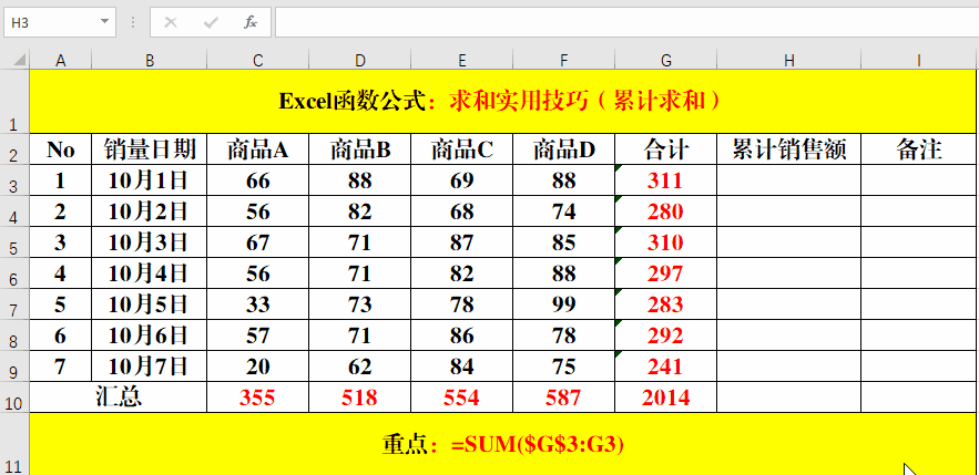 在目標(biāo)單元格中輸入公式:=SUM($G$3:G3)。